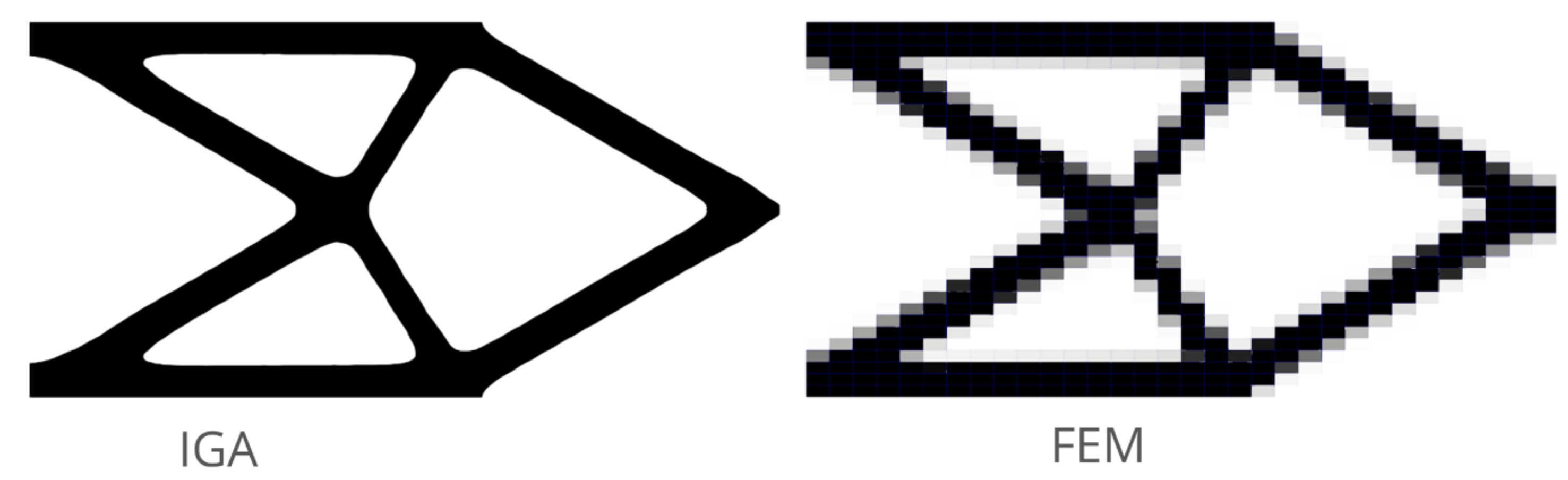 In comparison with disrete-density FEM, continuous density function with IGA provides a smooth, manufacturable design for the same mesh.