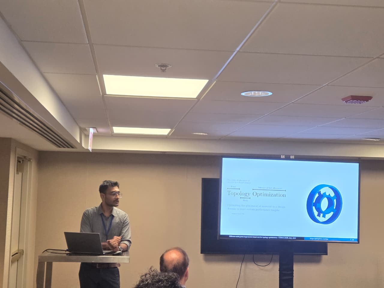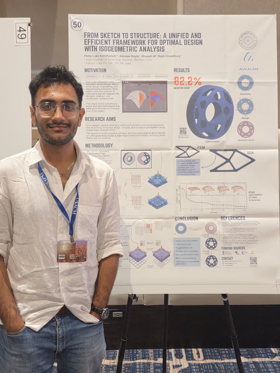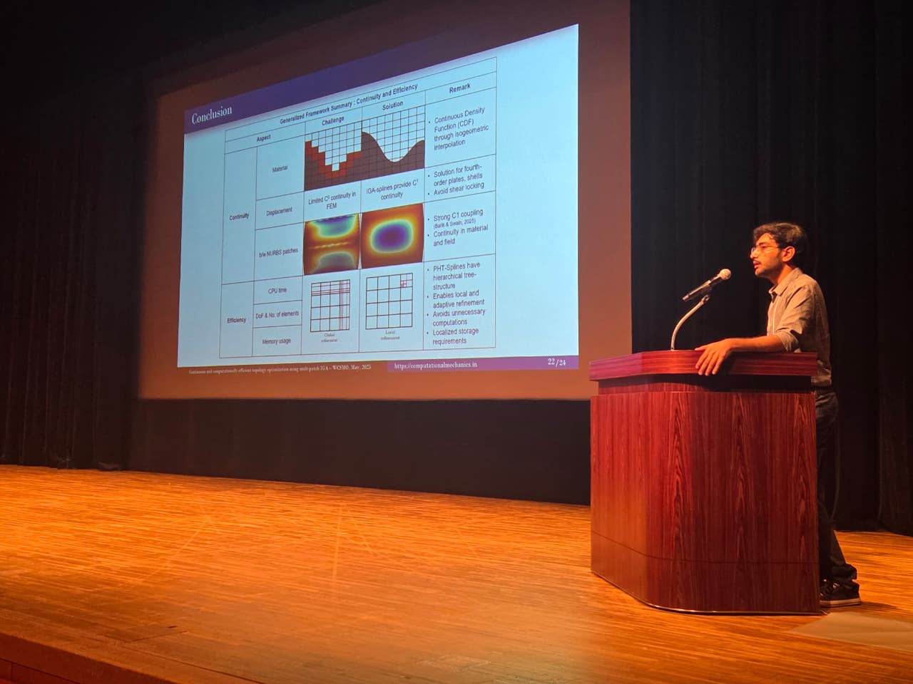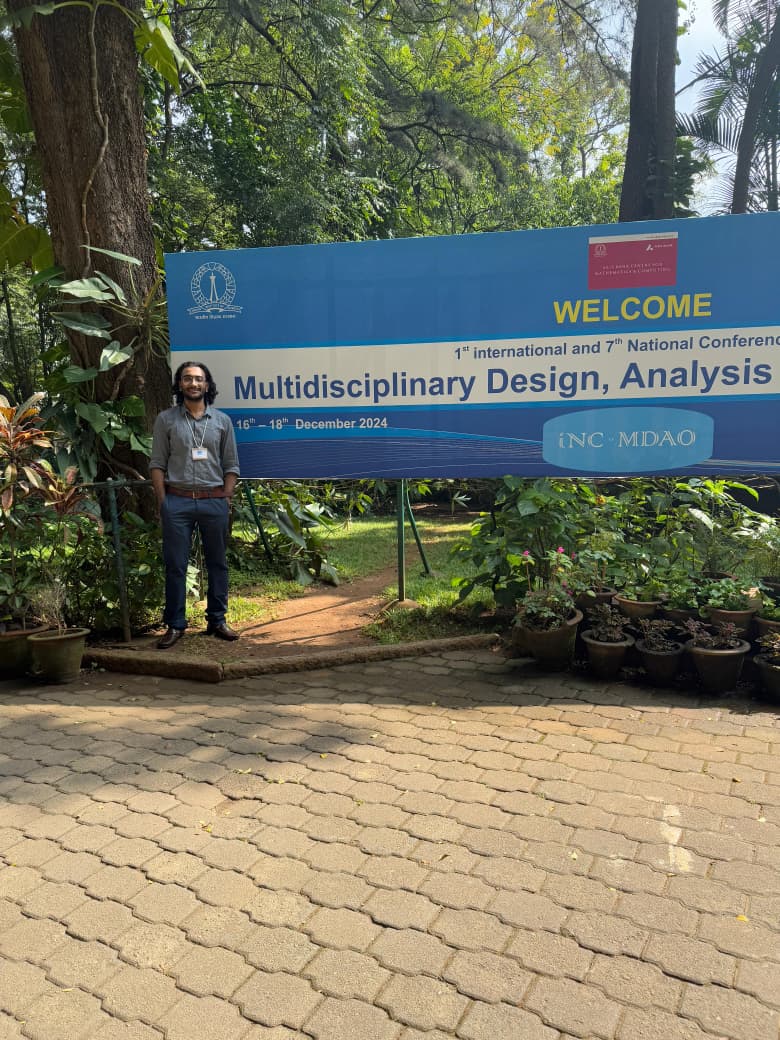 1st International and 7th National Conference on Multidisciplinary Design, Analysis and Optimization (iNCMDAO 2024), held Indian Institute of Science (IISc), Bengaluru, from December 16 – 18, 2024. My paper dealt with inverse material design on generating the geometry of auxetic metamaterials (materials with negative Poisson’s ratio) using structural topology optimization. Had the opportunity to meet and interact with Dr. Ole Sigmund, the pioneer of topology optimization.